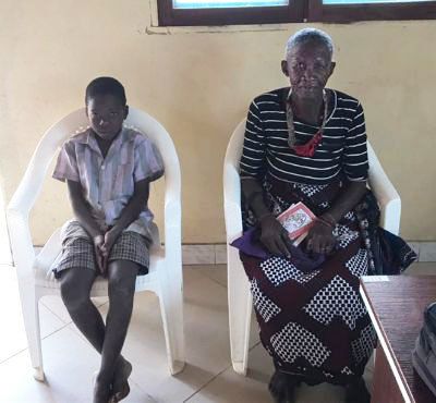 Here is a sharp/spry grandma who fled the insurgency. She was hiding in the bush for 7 days. She came across this 10 year old boy who lost his family and decided to take care of him ... brought him with her to Mueda.