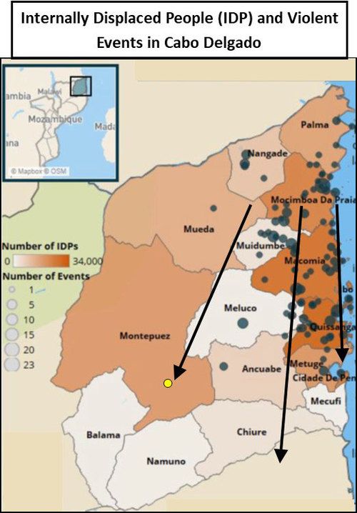 This map shows our Province in Mozambique with its districts. The yellow circle is the town we live in. The green circles mark areas where attacks have happened. The arrows indicate the major movement of the refugees. According to the UN there are more than 200,000 Internally Displaced People.